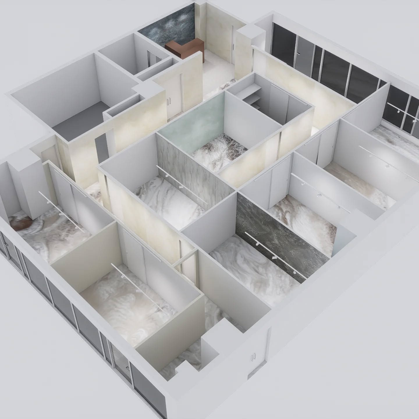 飾り窓の型抜きからベンチの造作・陳列台の型抜きから始まり、Jewelryの邪魔にならないようかつJewelryを引き立てるよう壁・床・什器・陳列台を全てコンティニューオとカラーラの同一色で質感を残しつつ無機質に仕上げました。